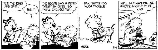 This Calvin and Hobbes strip by Bill Watterson printed August 1986 humorously illustrates the attitude of economy when it comes to pancakes. It may have amused President Coolidge to see this duo’s attempt at thrift when it came to making breakfast.