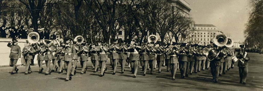 View down Pennsylvania Avenue, with the Capitol in the background, as a wide variety of America’s servicemen march in honor of President Coolidge’s inauguration. Upwards of 8,000 men and women took part in the impressively efficient fifty minute parade.