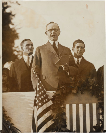 Colonel Coolidge inspects the lead vehicle of the Coolidge-Dawes Lincoln Tour about to depart from Plymouth, September 1924. The driver, John P. Cowan of Pittsburgh, would use this unique means of bringing Coolidge to the country. A thoroughly grassroots movement, the Coolidge-Dawes Lincoln Tour would see 5 million participants in 100,000 automobiles before reaching their final stop on the Pacific. It must have contributed mightily to the result since on November 4, Calvin Coolidge decisively beat the combined political support of both his challengers with 15.7 million votes, carrying 35 of 48 states and securing 382 electoral votes out of 266 needed to win. His 25.2 point margin victory is one of the largest popular votes garnered to this day.