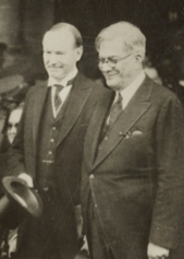 Coolidge is seen here meeting with a Knights of Columbus delegation to discuss religious freedoms in Mexico, at the summer White House, Adirondacks, 1926. From L to R, they are: Supreme Advocate Luke E. Hart, Deputy Supreme Knight Martin Carmody, Supreme Knight James A. Flaherty, President Coolidge, Supreme Secretary William J. McGinley, Supreme Director William C. Prout, and Assistant Supreme Secretary John Conway.