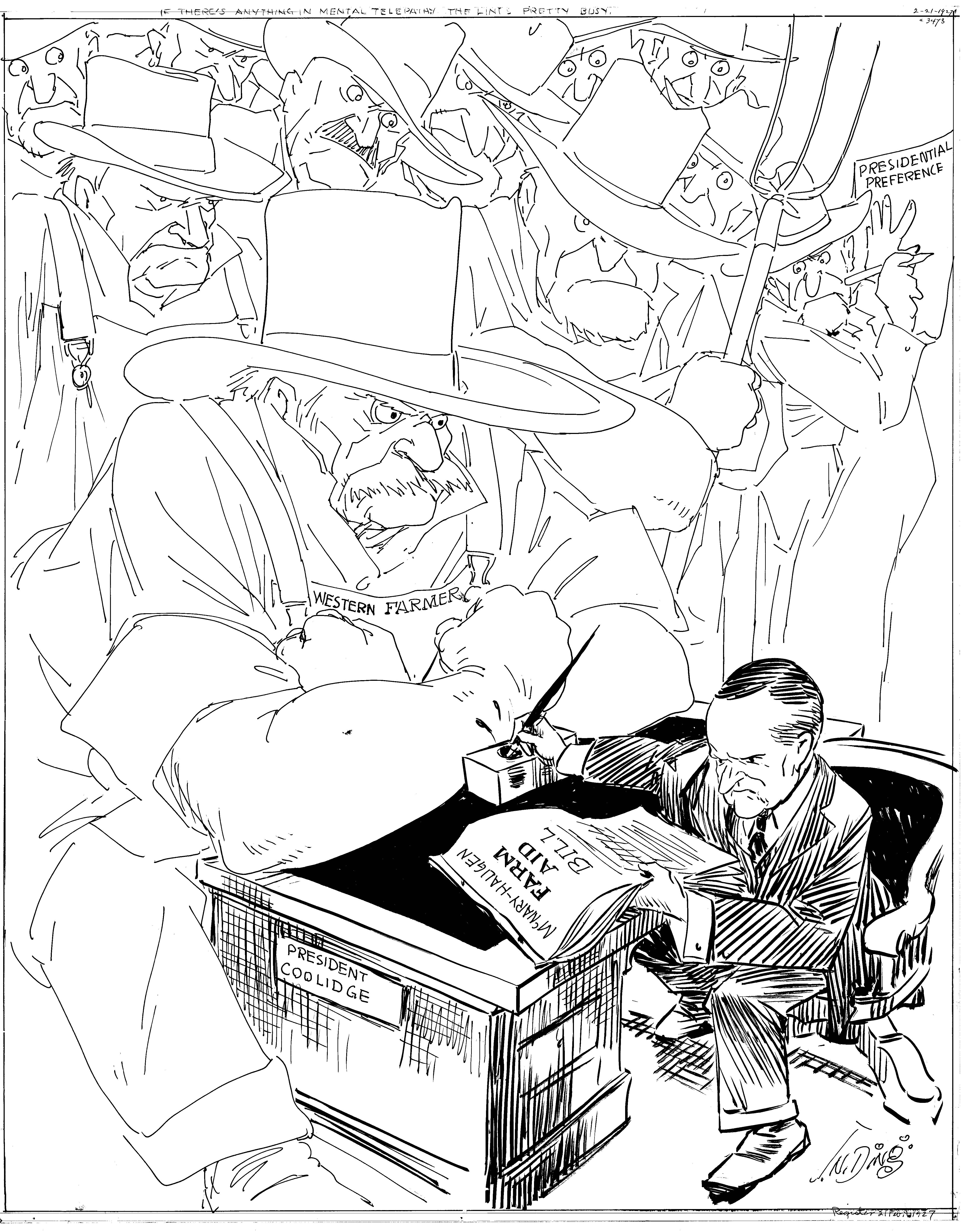 “If there’s anything in mental telepathy, the line’s pretty busy,” by “Ding” Darling, The Des Moines Register, February 21, 1927. Courtesy of the Ding Darling Foundation.
