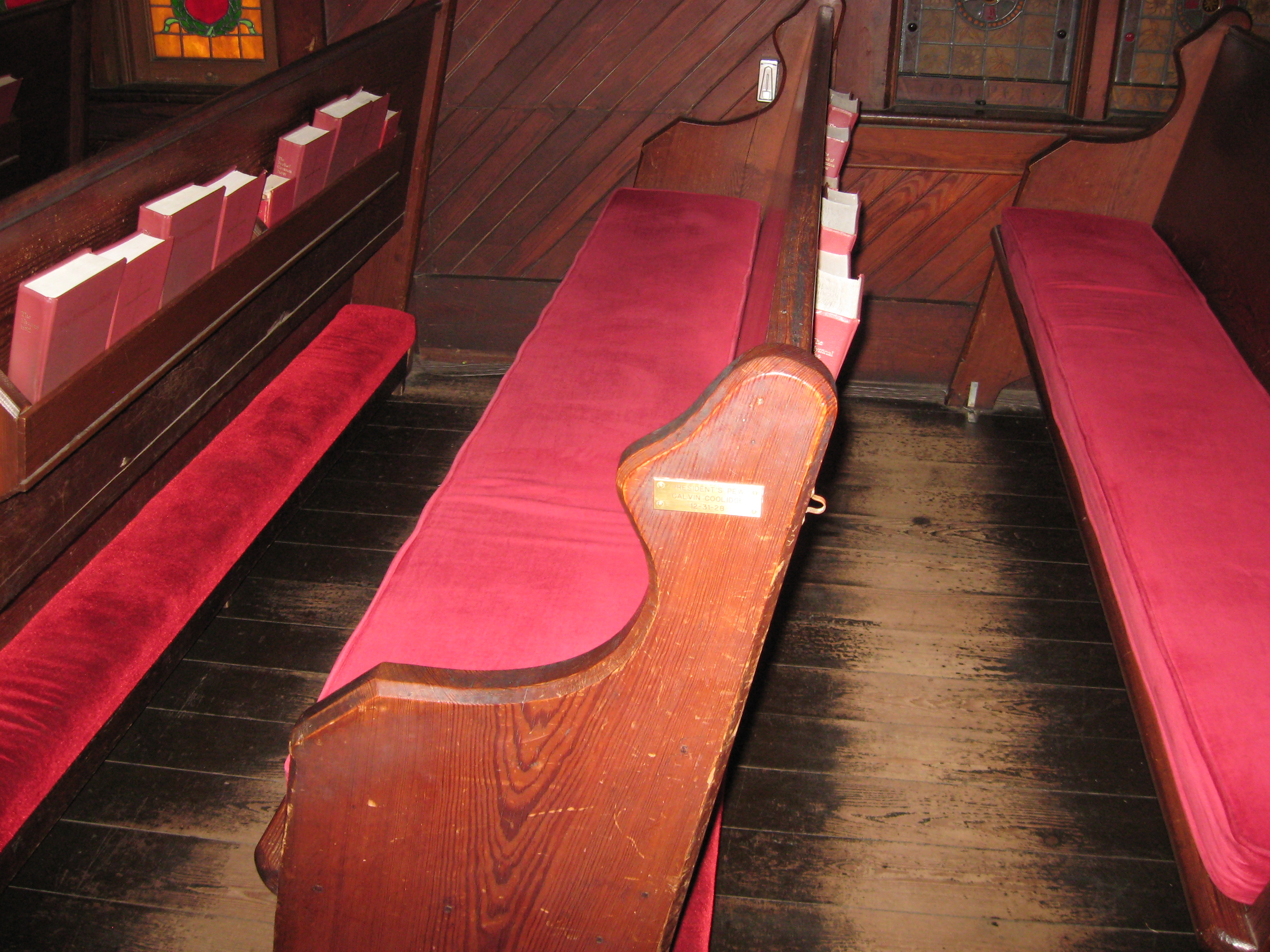 The Coolidge Pew, where the President and Mrs. Coolidge sat during the services. The plaque is mis-marked, dating the service on a Monday instead of Sunday, December 30.