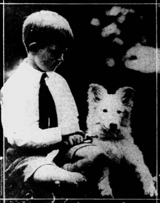Robert Scripps posing with Diana/Calamity Jane in Rapid City, as he and his sister present the puppy to the President, July 1927.