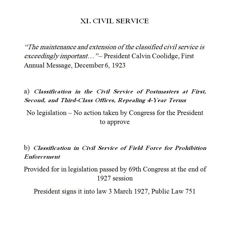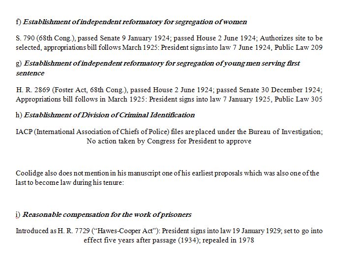 Residing in the Coolidge Collection at Forbes Library in Northampton, Massachusetts, is this surprising manuscript among his papers, entitled, “Recommendations 1923 Message and Actions Taken.” In it, Coolidge has kept track of each of his proposals but also what happened legislatively to them by the end of his administration. The very existence of this record defies the impression that Cal sat back, slept through his terms of office, and cared little or nothing about what was going on and what needed doing. It is especially instructive that he continued to keep tabs on the developments from his Second Annual Message delivered the December after Calvin Jr.’s death, when (as some has persistently claimed) that he checked out for good and rode out the rest of his time. Of course, it must be noted that many of these proposals had their inception under President Harding’s administration, but it is to Coolidge’s greater credit that these measures were adopted at all (rather than simply dropped by the new President), at times even shepherded to completion, by Cal’s diligent, if also steady and often unseen, pressure. Many thanks go to Mrs. Julie Bartlett Nelson, archivist at Forbes, for her kind assistant in securing a copy of this manuscript for our research.