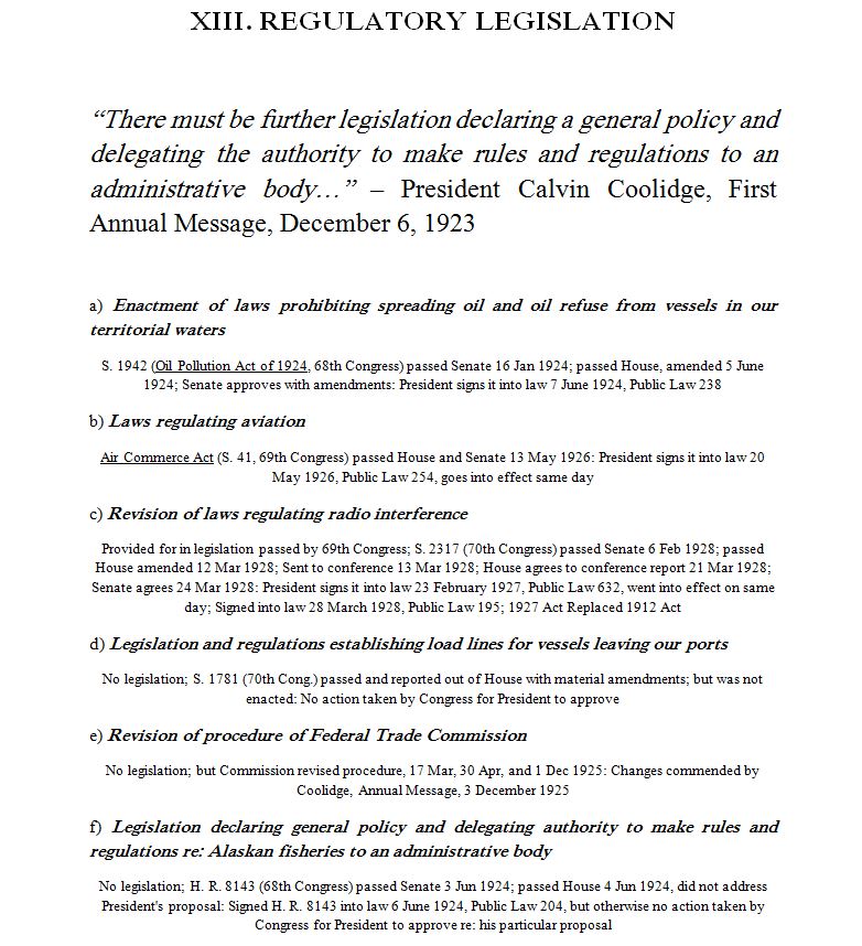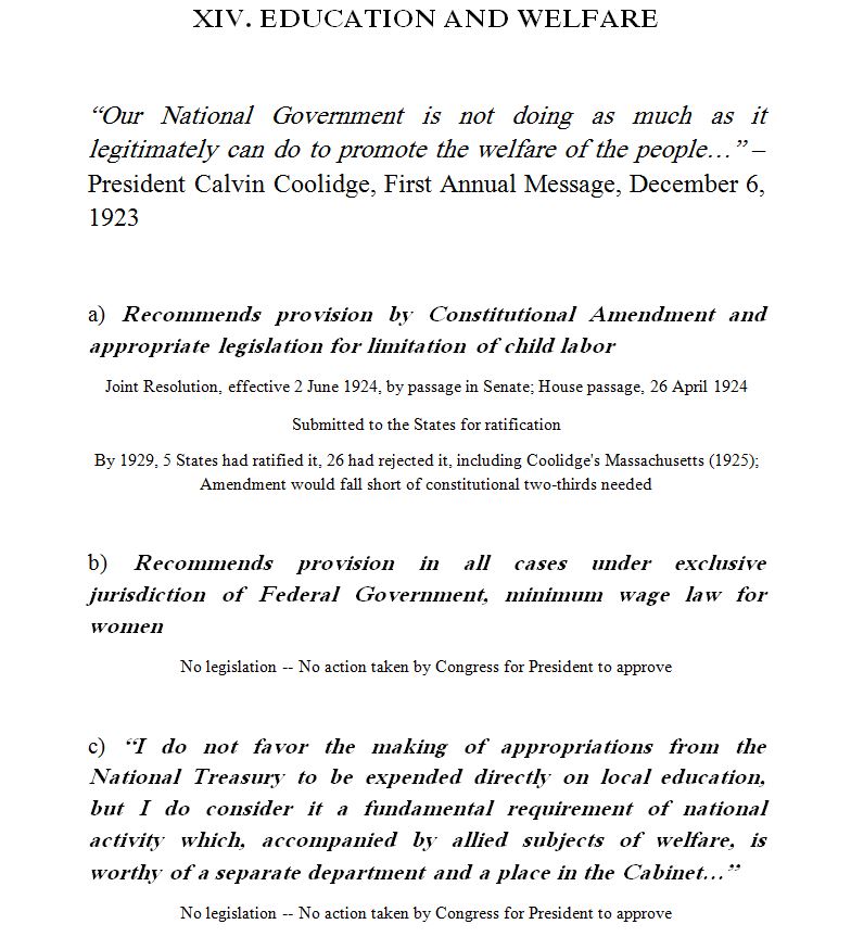 As this document should reveal, Coolidge was anything but inactive during his six years in office. Though he had a gift for delegation and a practiced hand for refraining after years of Presidents rushing in to handle an issue, Coolidge still did when the time came to do what needed doing. His sixty-six recommendations – from his First Annual Message alone – grouped into twenty-three categories, would be combined with numerous others pushed in his subsequent speeches. There was no sitting back and waiting for others to present the vision for his administration’s policy, he would do it himself. Moreover, while a mere sixteen of his recommendations met with no action on the part of Congress, the vast majority produced some result, just as Cal would claim in his Autobiography.
