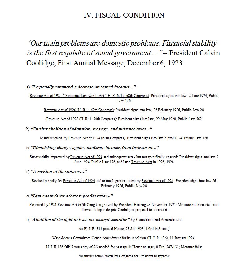Coolidge’s manuscript does not end there, however, it goes on to enumerate the policies he recommends in the Second Annual Message and what was done about them during his five and a half years in office. For our purposes here, however, it seems obvious from looking at his First Annual Message alone that President Calvin Coolidge was anything but a “do-nothing,” with no agenda, no direction, no focus of his own. The contents of this document refute that oft-repeated perception. He was anything but inactive, continuing to keep this kind of legislative diary all the way to February of 1929.