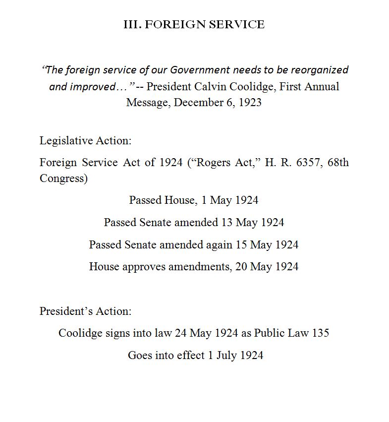 Next is President Coolidge’s proposal to reorganize and improve the Foreign Service: