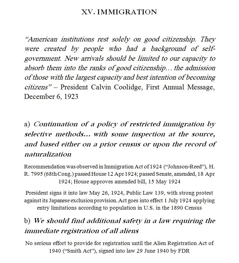 Coolidge would continue a policy of limitation when it came to immigration, believing that the Constitution does legitimately authorize Congress to make and the President to approve laws of entry and citizenship. He also knew from the practical experience of years in immigrant-rich Massachusetts that removing all restrictions – aside from the criminal and dangerous – harmed those, born and naturalized, already here by taking away opportunity from those who had become established as citizens, presenting those most recently arrived with the lesson that rewards precede responsibilities, the preferential treatment of simply arriving rather than the honor of work and earned citizenship. Coolidge recommends: