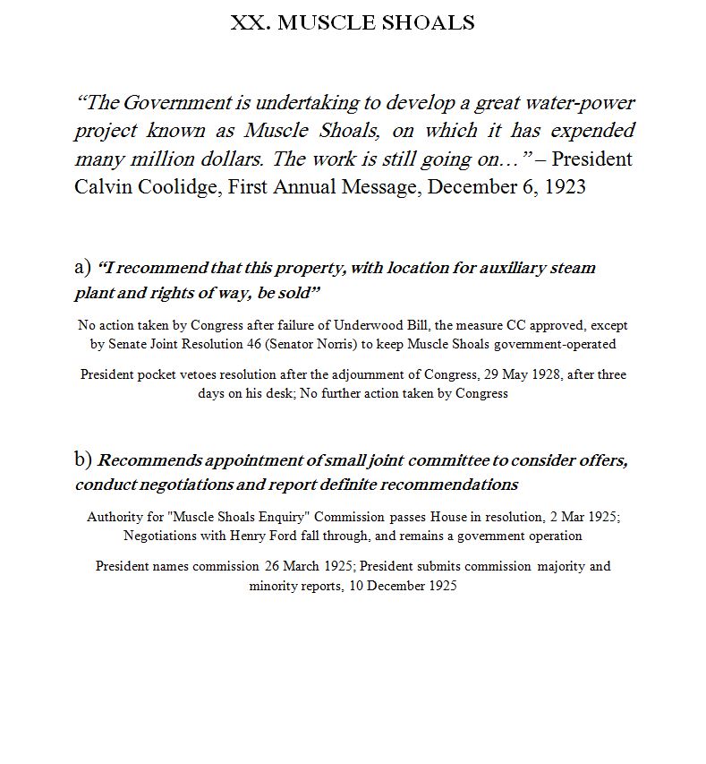Another nagging problem that seemed to refuse resolution during the Coolidge years was what to do about Muscle Shoals, the water-power plant seized under President Wilson to produce munitions. Again, the Farm Bloc would stand in the way of selling the property and getting government out of its operation, as we see below: