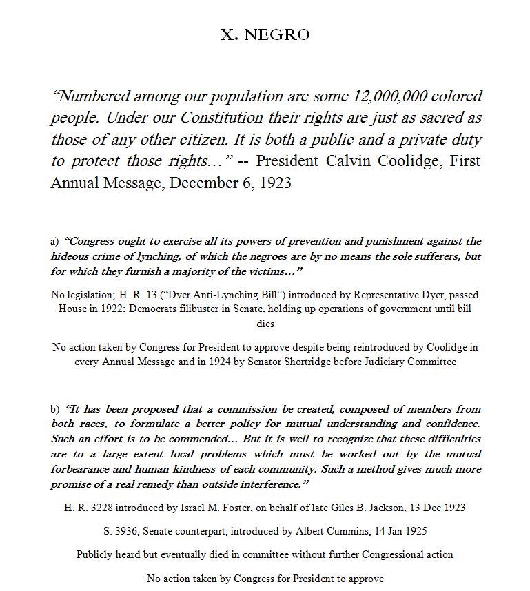 Next in the broad range of subjects Coolidge includes in his manuscript tracking what came out of his First Annual Message proposals is this perhaps even more controversial issue, the Negro. It is important to note here that not only did President Coolidge make a point of reminding Congress every year he was in office of the situation concerning black Americans but also of his two principal recommendations for the betterment of the whole country, regardless of color. The sooner the nation moved forward together, judging people on the basis of character, the better conditions would be. It is also insightful that while the lynching law never passed, lynching went down steadily throughout the Coolidge administration from its appallingly high numbers in the decades preceding him. This was hardly coincidental. It is also revealing that on more than one occasion Coolidge writes, “No legislation,” when, in fact, legislation had been drafted, even passed one chamber of Congress, but because good intentions did not stand in for substantive action in Coolidge’s estimation, without concrete results he could honestly declare nothing came of the matter.