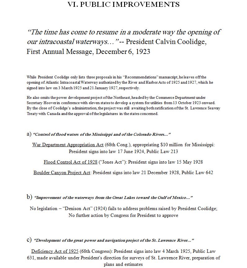 Public Improvements are enumerated next in the Coolidge manuscript, mirroring their placement in the First Annual Message: