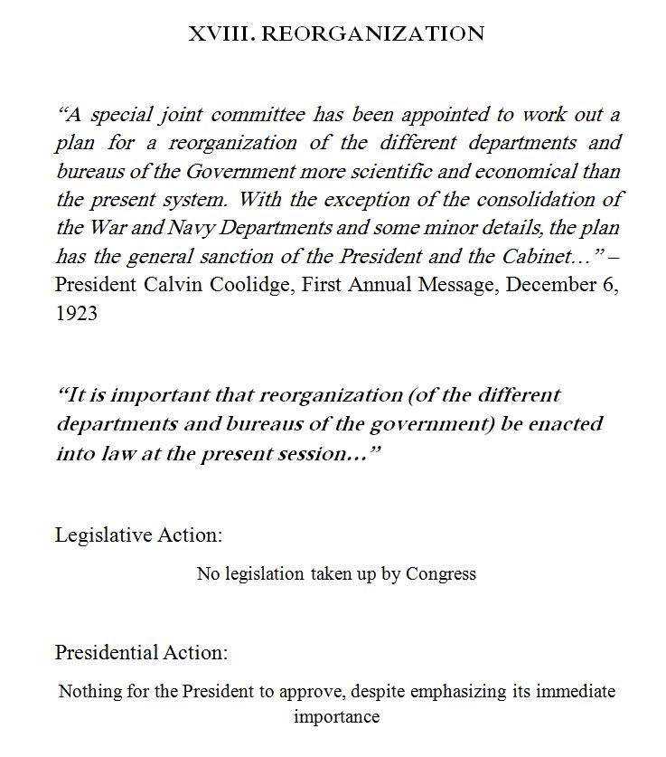 Reorganization was Coolidge’s most unfortunately unsuccessful proposals, directed as it was against the creeping bureaucracy that had accumulated in his day. It was something he had already tackled at the state level, reorganizing twenty departments out of the one hundred and twenty that dotted Beacon Hill when he took office as Governor of Massachusetts. Anyone who had watched Coolidge knew he could do it again, if given the chance, even at the Federal level. The President bravely “went there,” where few are bold enough ever to venture. Here stands his recommendation and its frustrating reply by Congress, for the ages: