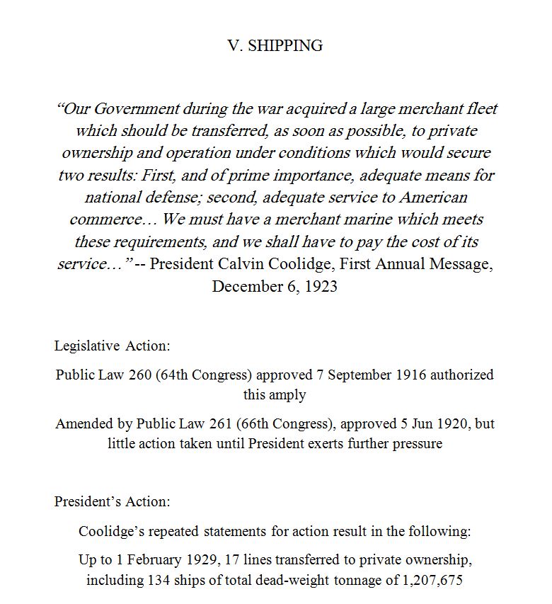 Shipping is featured fifth in this manuscript, while it falls ninth in his First Annual Message. It is noteworthy that the Merchant Marine Act of 1928 (popularly known as “Jones-White”) attempted to serve Coolidge’s twin goals of adequate defense and commerce yet after a long, difficult fight over the expense of the legislation, Coolidge signed a significantly less costly version on 22 May 1928. Interestingly, it is noticeably absent from his list of “Recommendations” held at Forbes Library.