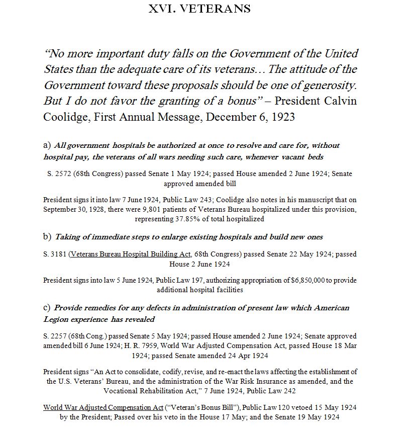 Veteran’s benefits are as accepted and expected today, if not more so, than any of the other welfare programs that have become part of society. Not so in Coolidge’s day. There certainly was one of the strongest legislative lobbies for veterans in existence but the President was not afraid to make enemies when it came to government picking winners and losers, preferring some and ignoring others. Calvin Coolidge held a different view. Not only was a Veteran’s Bonus playing favorites with a specific demographic at the expense of the whole people, it was presuming to place a monetary value on their service, something Cal regarded as beyond material reward. It demeaned their sacrifice not honored it. This is why he vetoed the Bonus Bill but also why he gives these three alternatives to best help our veterans: