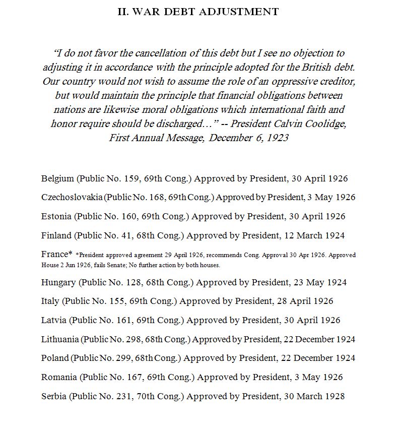 Fittingly, second in Coolidge’s list is the settling of World War I debts owed to the United States, despite it appearing fourth in his actual speech: