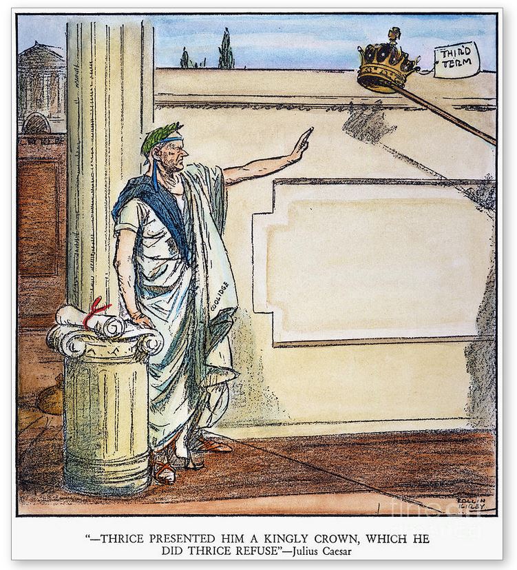 Political illustration depicting Coolidge, in the tradition of Roman republicans from Cincinnatus onward, after his steadfast refusal to extend his executive powers for another four years. Coolidge resolved instead to leave public office, lay down the mantle of authority and step out of the limelight for others chosen by the American people to succeed him. Cartoon by Rollin Kirby appearing in The New York World, March 24, 1928.