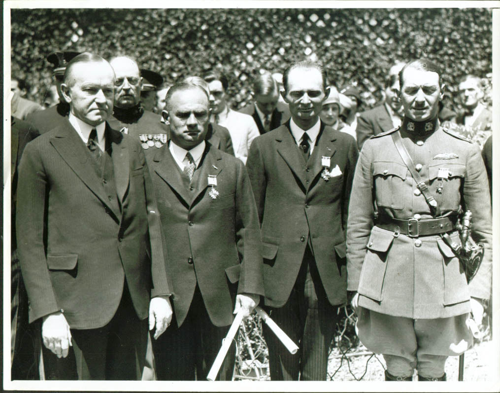President Coolidge honoring the aviation pioneers of the Junker “Bremen” for the first East to West transatlantic crossing accomplished in April 1928. Here the crew, L to R: Captain Hermann Kohl, Baron von Huenefeld (both of Germany), and Major James C. Fitzmaurice (of Ireland), are bestowed the Distinguished Flying Cross, the highest award in aviation, by President Coolidge at the White House, May 1928.