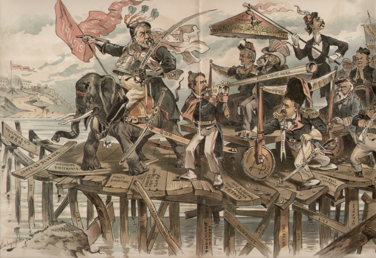One of several “Puck” cartoons depicting the “waving of the bloody shirt,” shown here as a cape around James G. Blaine’s neck (as he sits atop the wounded GOP elephant) an appeal to the sacrifice of martyrs, heroes, and patriots for the country as a distraction from a policy question or an otherwise weak political campaign. The metaphor in American politics originated out of the 1868 Republican campaign as a device to generate sympathy for GOP positions by further politicizing the sacrifice and service of Union (hear Republican) veterans in the long and bloody war won against those who stood accused of betraying and splitting the Union, the Democrat South. This is from 1884 but, unfortunately, there is no Grover Cleveland running this time.