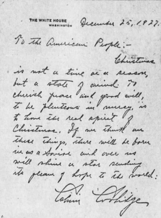 Joanna McCool and the team at the Coolidge Presidential Foundation has put together a series of readings from Coolidge’s 1927 handwritten Christmas Message, given to the American people ninety-three years ago. May this be a truly Merry Christmas and one, for each of us, that captures the real spirit of the day, just as Cal expressed it.