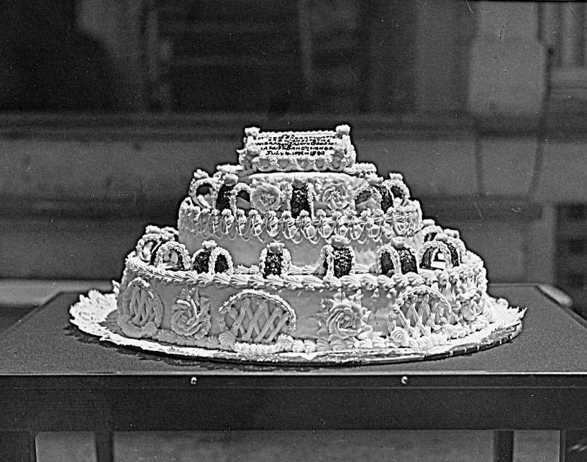 Dugan Brothers Bakery, long renowned for its delectable pastries, breads, cakes, and other home-delivered offerings, also brought (in addition to the massive 2 foot+ diameter cake pictured here) large bouquets for Mrs. Coolidge and private secretary Miss Mae Hayes along with this wonderfully kind note: