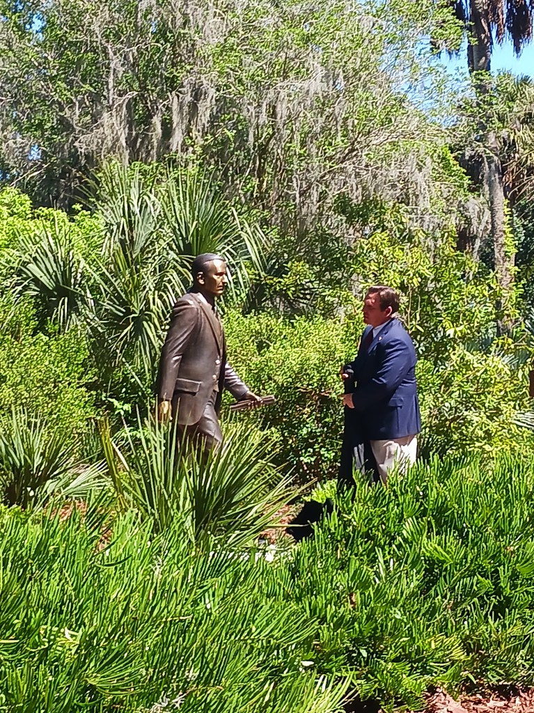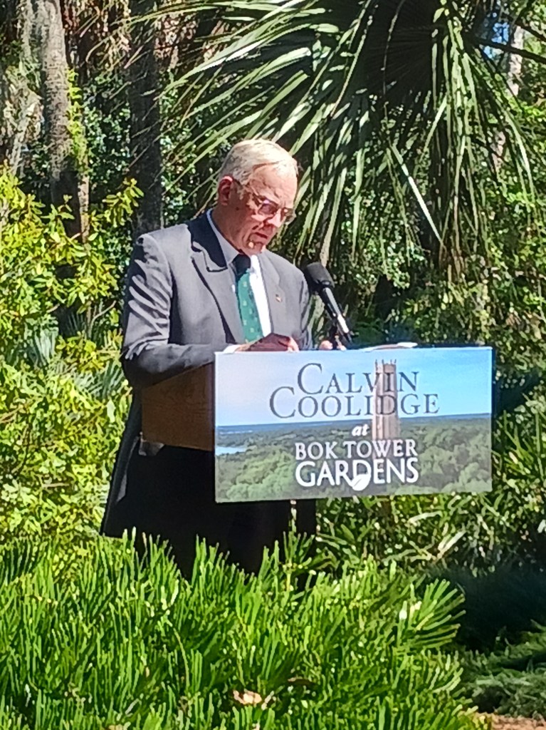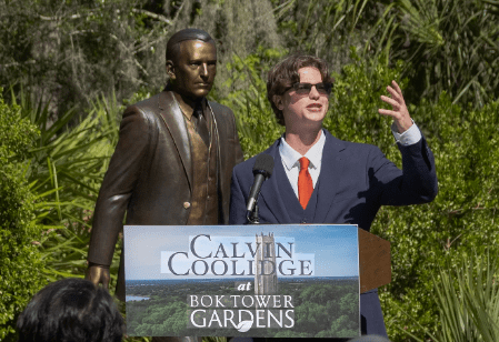 Perhaps one of the best ways to spend Tax Day, April 15, was observed this past Wednesday at Bok Tower Gardens in Lake Wales, Florida, with the dedication of a bronze statue of President Calvin Coolidge by Governor Ron DeSantis. Honoring not only Cal’s Sunshine State connections but his highly underrated accomplishments as the POTUS #30, the occasion was marked by a well-attended gathering of Coolidge friends, Secretary of State Cord Byrd, Bok Tower leaders, representatives of the FDOT, Polk County educators, the Chairman and Board representatives from the Coolidge Presidential Foundation, and other honored guests. The Governor furnished a detailed consideration of Cal’s career and lasting legacy with the reasons for so deserving a distinction struck in such an enduring and masterful form by sculptor Austin Weishel. The Governor sees in Coolidge a President whom, more than any other in the last hundred years, the Founders would have identified as the most powerful representative of the vital and equitable balance encapsulated in constitutionalist leadership.