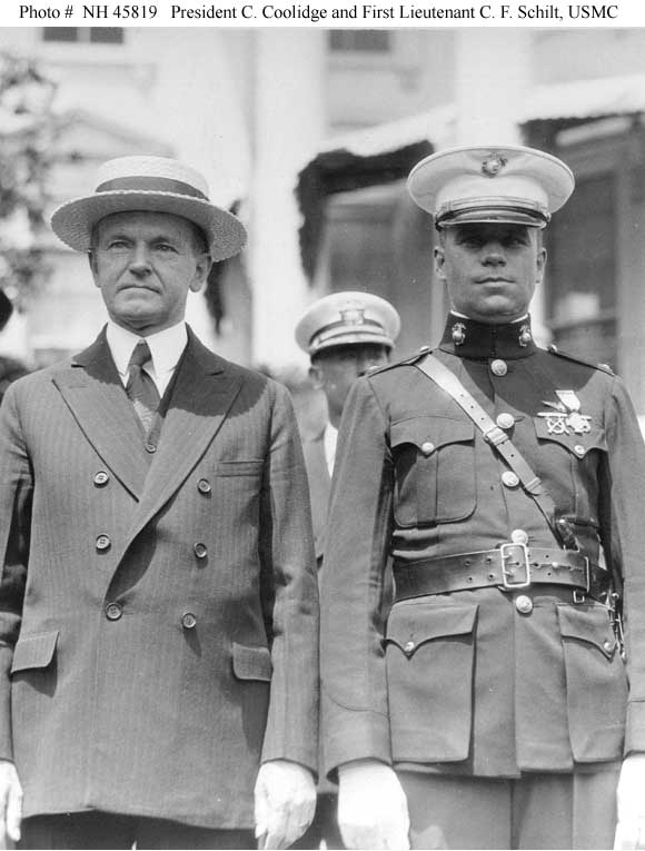 Here is First Lieutenant Christian Frank Schilt, USMC, to whom the President has just given the Medal of Honor for his superb actions in Quilali, Nicaragua, over the course of three grueling days in January 1928. First Lieutenant Schilt, following an intense fight to restore peace to the area, volunteered to evacuate all of the wounded by air and bring in a new commanding officer as relief. Taking off a total of ten times while under steady enemy fire from rough urban terrain, he removed all the wounded, saved three lives and brought back the necessary supplies to those in dire need on the ground.