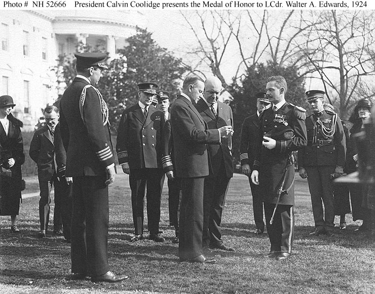 Lieutenant Commander Walter Atlee Edwards, USN, was awarded the Medal of Honor for his rescue of 482 men, women and children from the sinking French transport Vinh-Long, while aflame in the Sea of Marmora, off the coast of Turkey. While commanding the USS Bainbridge, he placed and kept his ship alongside the burning wreck until all alive were safely transferred to the American vessel.