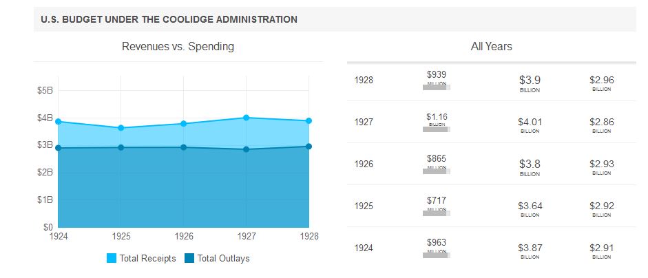 A look at the Federal Budget Surpluses and Deficit totals from Harding through Hoover after the Budget and Accounting Act of 1921. Coolidge maintained healthy surpluses all six years of his tenure.
