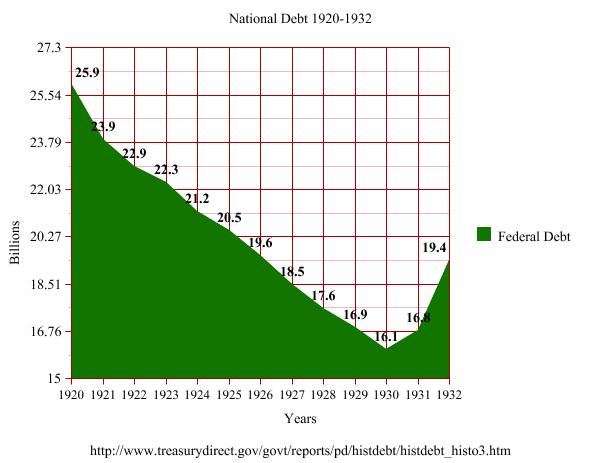 Graph encompasses the final year of President Wilson through the third year of President Hoover. Notice the consistent retirement of debt each year of the Harding and Coolidge administrations. It was so strong a system that it carried forward into Hoover’s first year, until spending resumed its climb from 1930 onward.