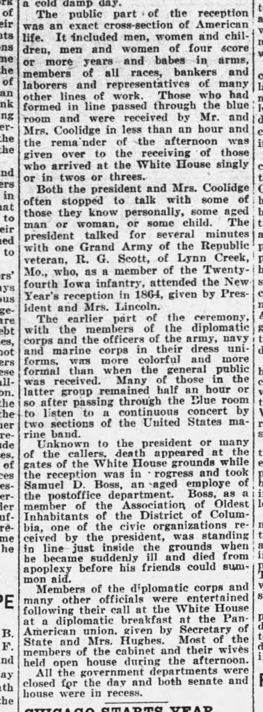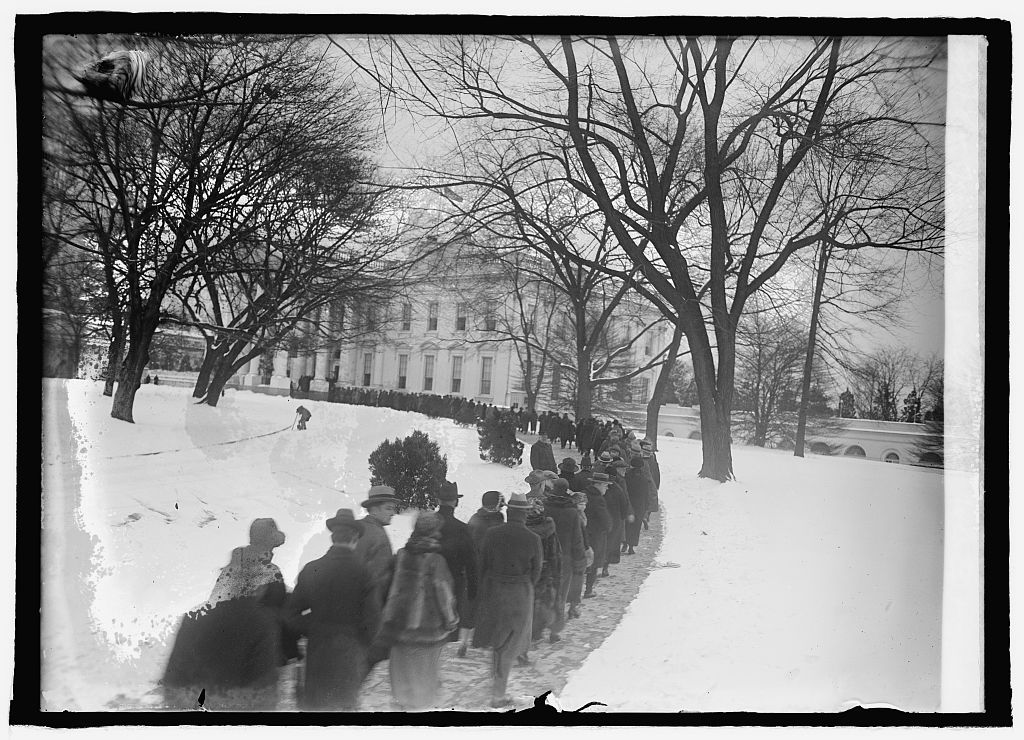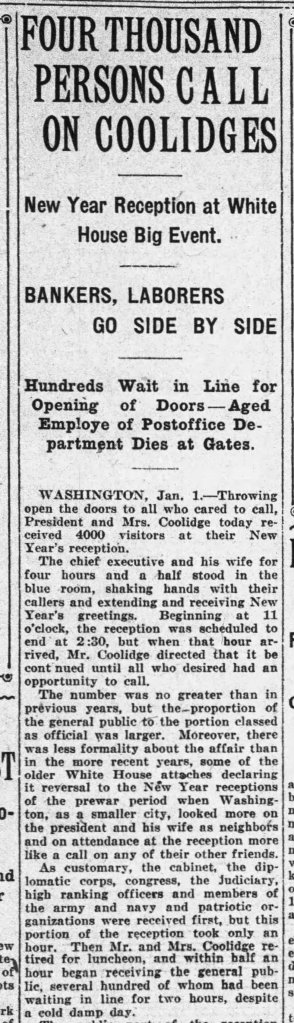 Mrs. Coolidge liked to go shopping herself, as she had always done in her home town of Northampton, and in Boston; and wishing to do so in peace, she often avoided using the White House car — always conspicuous because of the President’s seal on the door panel — doing her errands on foot. But no sooner did she enter a store than news of her arrival spread quickly to all departments; and often a respectful, keenly interested crow would gather and stand nearby, gazing their fill, missing no detail of the way in which this First Lady made her purchases–what she bought, and how much of it; and Mrs. Coolidge, with her quick human sympathy, was always understanding and patient with this type of interest. But when in one large shop where she had gone to the street floor to buy gloves and stockings, she was almost immediately approached by a well-meaning saleswoman from another department carrying a large collection of evening wraps over her arm, and bringing them to Mrs. Coolidge’s attention–she was annoyed, and left the shop as soon as possible, for she disliked being made conspicuous. ‘If,’ she afterwards said to me, ‘I had wanted an evening coat, I would have gone to the department where they are sold’…