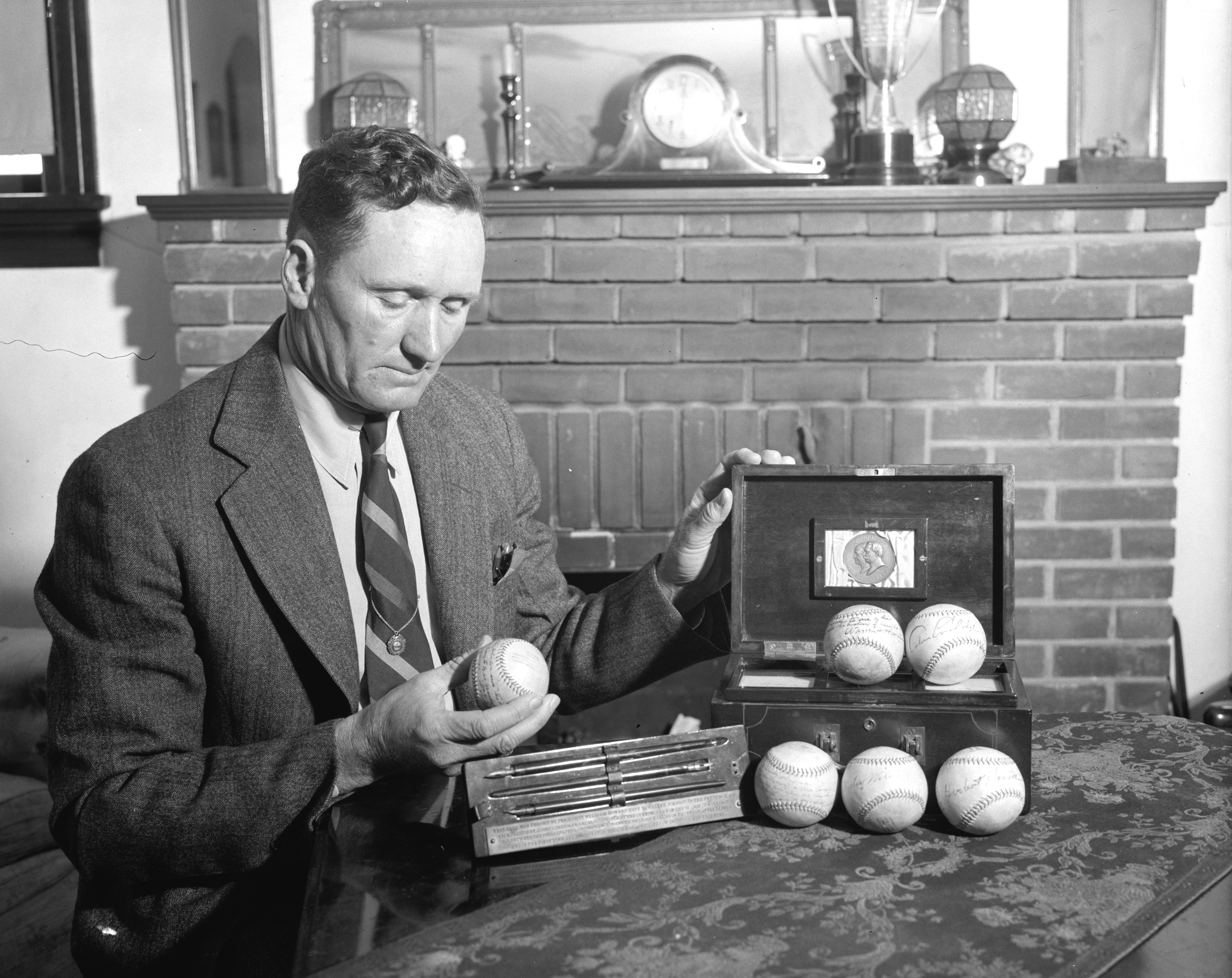 A fascinating entry over at an excellent blog dubbed “Ghosts of DC,” has featured an older Walter “Big Train” Johnson from April 29, 1939, reminiscing over his unique collection of baseballs signed by six Presidents, four of which were thrown out at the start of World Series games. As we recall, it was during Mr. Coolidge’s time in the White House that the Senators won their first and only World Series pennant in 1924 and almost repeated the victory in a 4-3 loss to the Pittsburgh Pirates in 1925. The six Presidents were: Theodore Roosevelt, William H. Taft, Woodrow Wilson, Warren G. Harding, Calvin Coolidge and Herbert Hoover. Some of these Presidents wrote extended messages to the great baseball player; others, like Coolidge, characteristically kept it brief. Notice that President Coolidge’s signature is prominently displayed on the right hand top shelf of this handsome case. Mr. Johnson, the legendary player and manager of the Washington Senators photographed here, would donate this impressive series of gifts to the Baseball Hall of Fame in Cooperstown, New York.