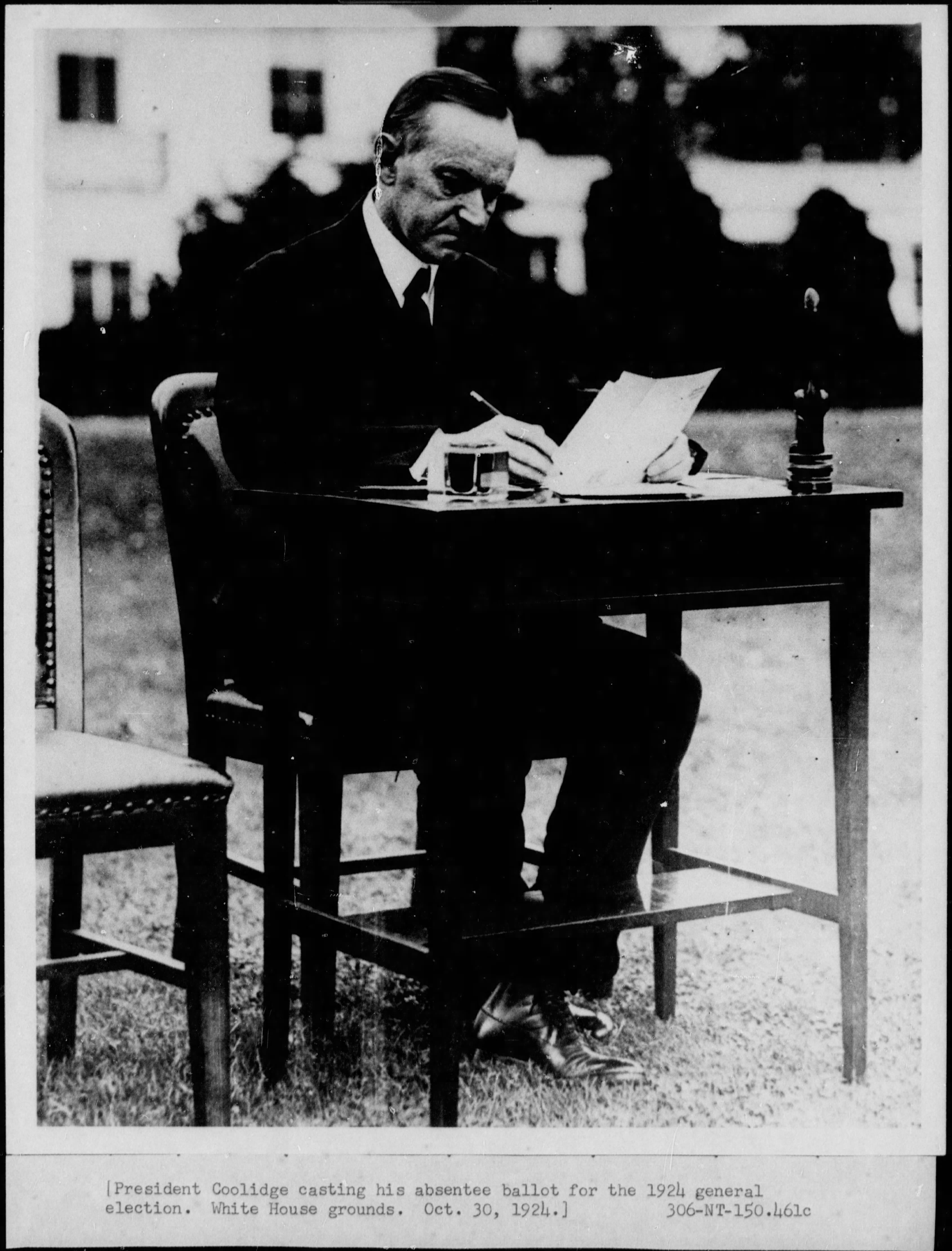 Grace Coolidge leading by example, completing her absentee ballot on the White House lawn, while both her and Calvin urge all Americans to get out and vote in that year's election, 1924.